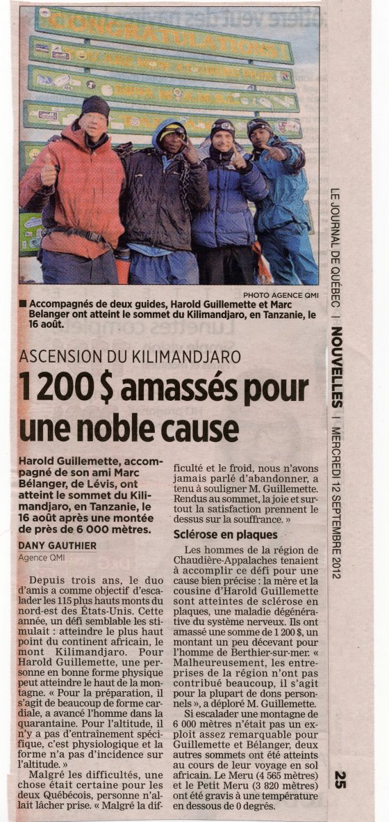 Mercredi dernier le journal de Québec publiait un article sur notre expédition au Kilimandjaro, Très bon article de Dany Gauthier.