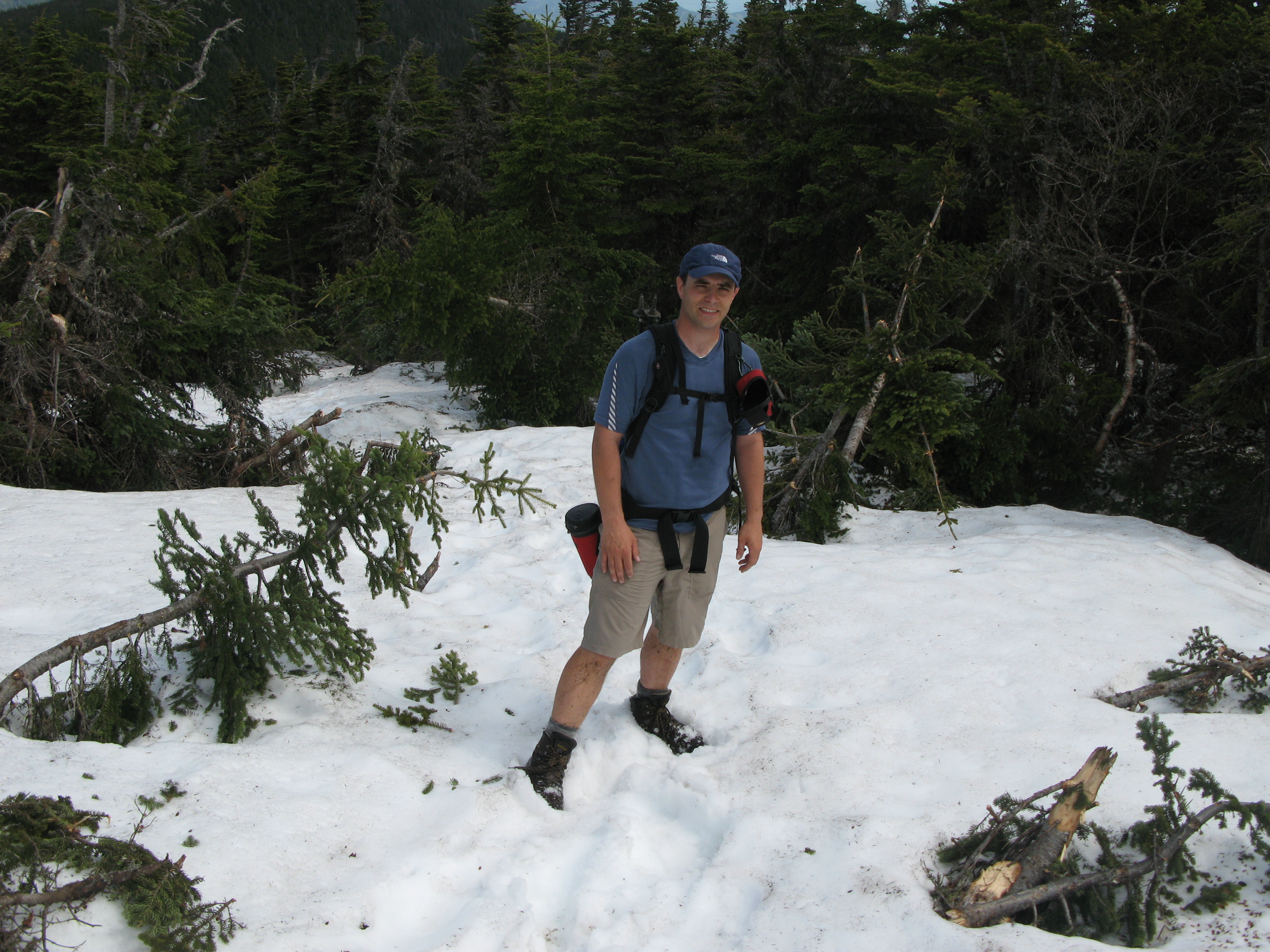 Le lendemain matin nous avons quitté Isabelle et Bruno car nous avons sauté un refuge (le Huart) pour se rendre 19 km plus loin à la Mésange tout près du pic de l’Aube. Au menu de la journée : le mont Arthur Allen (980 m.), le mont du Blizzard (976 m.) et le pic de l’Aube (920 m.) qui offrait une magnifique vue sur le Pic du Brûlé. Rendu à la Mésange vers 16h00 nous avons rejoint un nouveau groupe de montagnards : Maryse, son mari Michel, Gaétan, Marie-Ève et Geneviève, ces dernières étant à leur dernier soir. Des gens très sympathique. Gaétan, Michel continuaient avec nous jusqu’à la fin de notre périple pour chacun de nos arrêts. Ce sont deux personnes très sympathiques avec qui nous avons échangés sur les mont de la Gaspésie. Michel est une bible vivante du parc de la Gaspésie et des environs. Nous avons appris beaucoup de ses 25 ans de randonnée!!! dans la merveilleuse Gaspésie. Michel et Gaétan sont membres l’équipe de recherche et sauvetage La Grande Ourse du Bas St-Laurent.