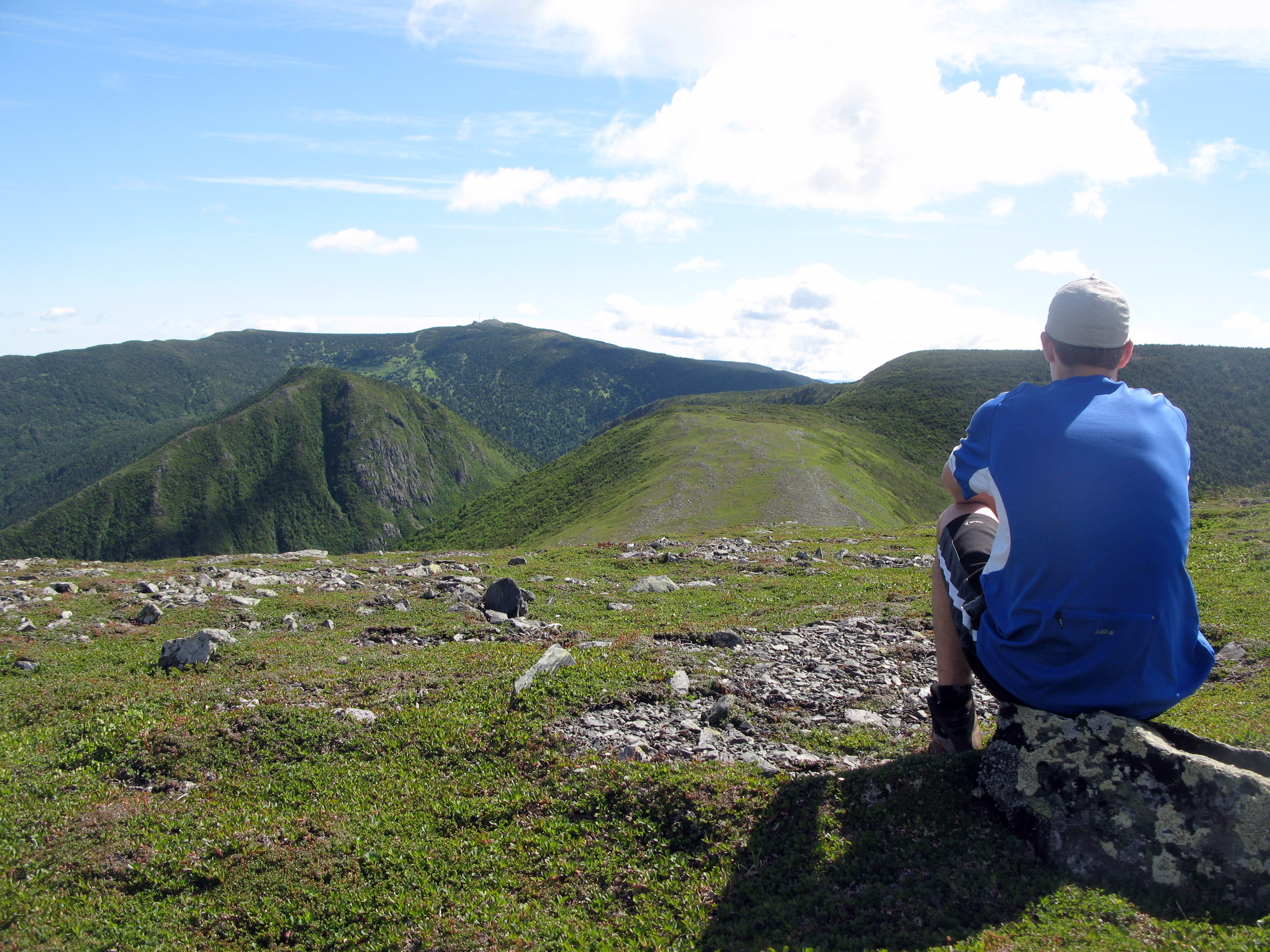 Après 20 minutes, nous atteignons le mont Matawees, le plus élevé de la réserve avec ses 1073 mètres, on se sent en équilibre sur sa crête, une sensation unique. Pendant la descente, nous avons eu la chance d’apercevoir un orignal en flanc de montagne, nous avons descendu quelques peu pour ensuite atteindre le Fortin (1020m.) au grand vent mais avec un regard sur les deux précédents; de toutes beautés. En cette longue journée, il ne restait qu’à emprunté les crêtes pour rejoindre le Logan (1150m.), soit une heure de randonnée. C’était ma quatrième visite sur ce majestueux sommet du parc de la Gaspésie, mais une première par beau temps. Je peux qualifié le sommet de dépotoir, même si des efforts notables ont été mis en place pour améliorer les lieux. Mais la vue est quand même sublime, toutes les montagnes de l’est à perte de vue, dont celles du parc. Et à l’ouest, celles que nous avions foulées un peu plus tôt dans la journée, le spectacle est gravé à tout jamais. Après ces soupirs devant les dames de la Gaspésie, il ne reste que 1,7 km pour aller relaxer nos pieds endoloris au refuge de la chouette.