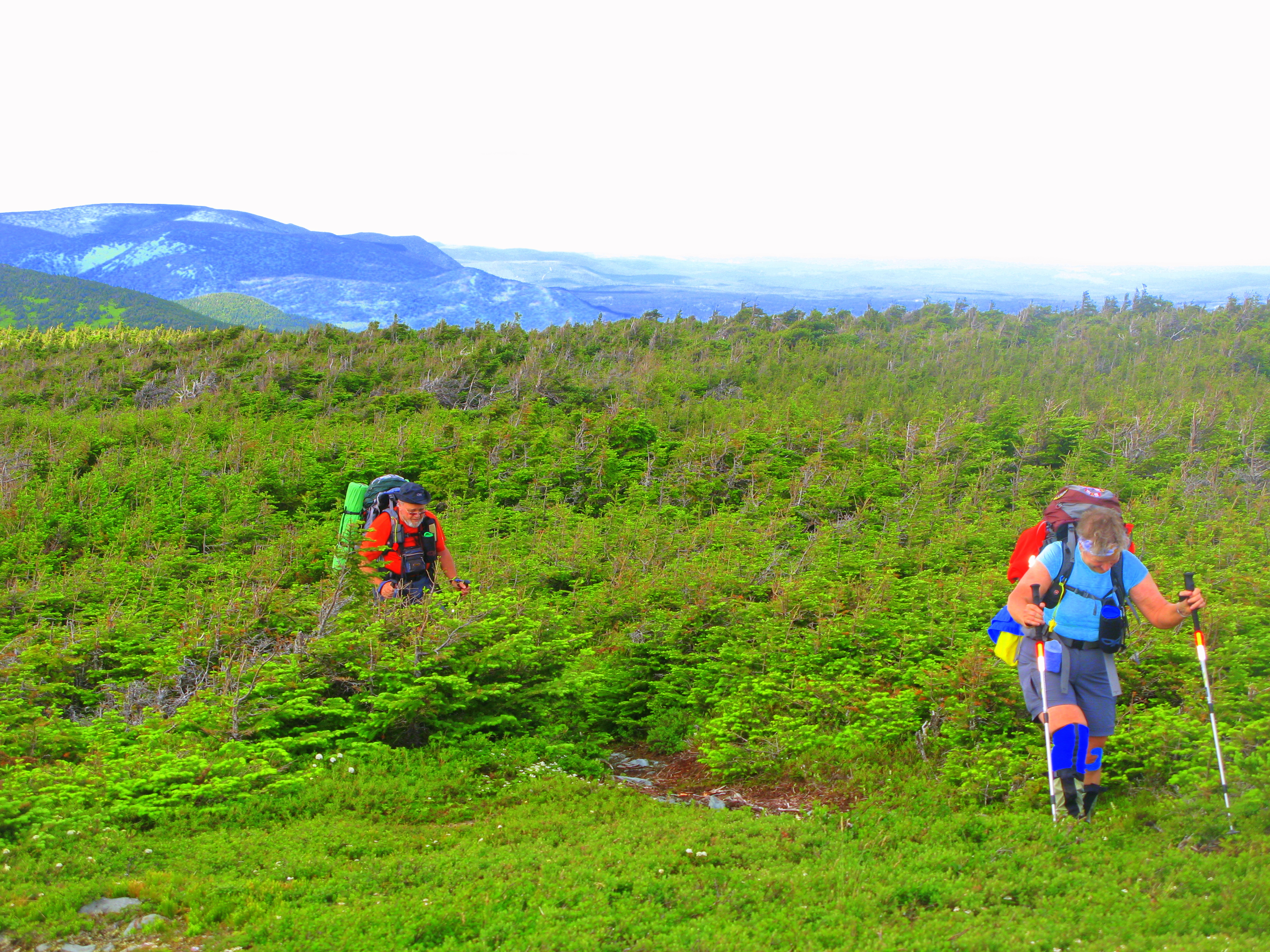 Levé à l’aube, soit vers 4h45, un bon déjeuner, un bon chocolat chaud et une promesse de beau temps dans le ciel. 6h30 départ pour la pénible et ardue côte des fougères. Sachant dans quoi je suis embarqué, cela me motive au plus haut point. Je prends les devant avec Alexandre, un jeune homme passionné par la randonnée et le plein air, le mot plaindre lui il ne connaît pas. Parle, parle, jase, jase…le temps file, on avale les kilomètres comme des petits pains chauds. La fougère commence à prendre le dessus sur tout, et le terrain s’escarpe de mètre en mètre et la cadence est excellente. Nous sommes en avance sur le groupe mais on décide de les attendre, on fait quand même partie de la même équipe et le but n’est pas de battre des records mais bien d’atteindre l’objectif des sommets.