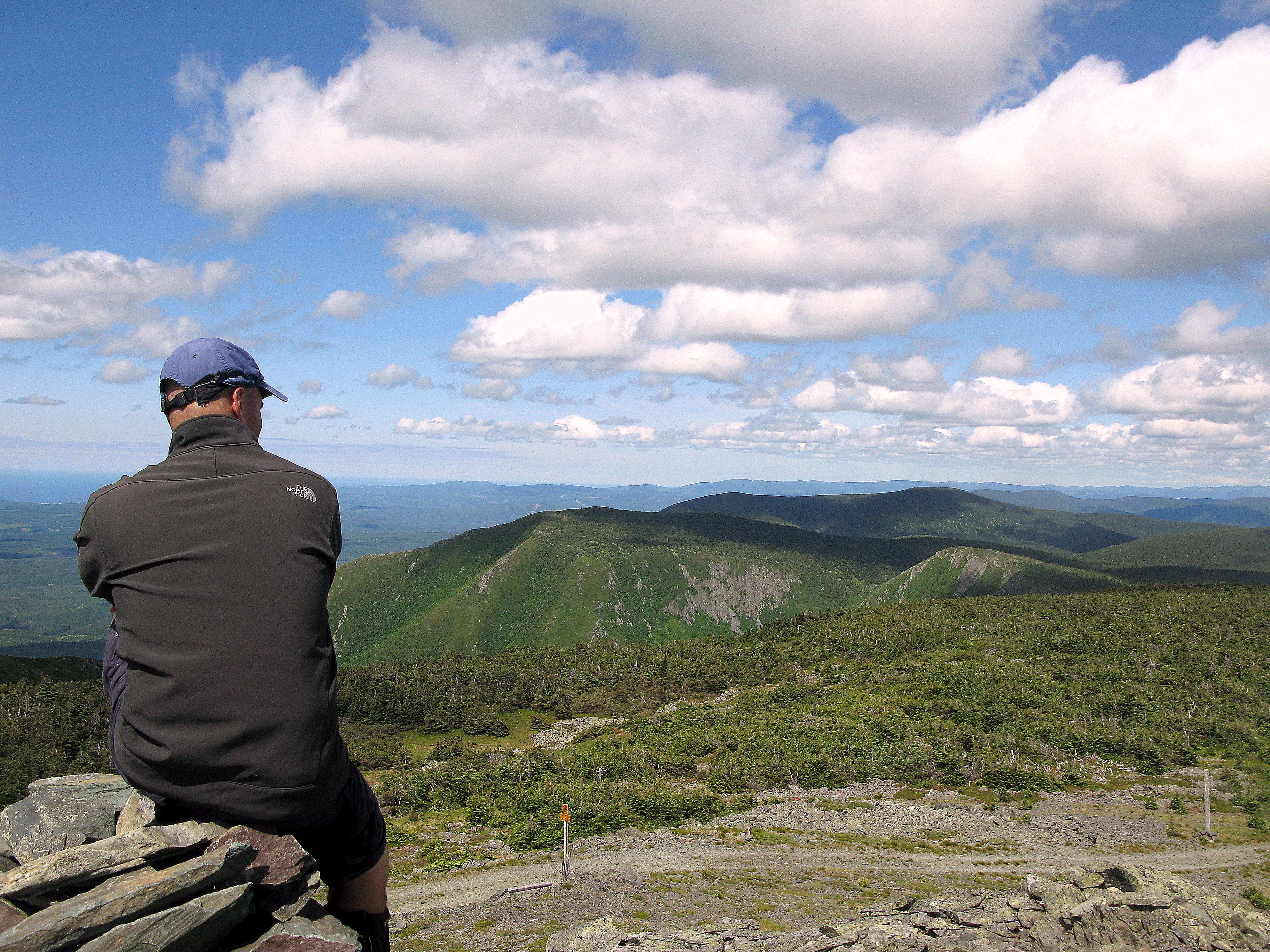Quelque temps après, les deux autres groupes nous rejoignent pour l’assaut final du Collins. Sur ce sommet dénudé, à plus de 1036 mètres, la récompense est grandiose, le spectacle y est tout à fait sublime; une vue à l’infinie!!! Vers l’est ce sont les sommets à venir qui se dévoile et au nord un fleuve Saint-Laurent splendide, à l’ouest les sommets de la réserve faunique. Le temps d’une bonne pause et de plusieurs photos pour se récompenser. Par contre, Maryse a un malaise à un genou, elle avance à son rythme et s’est bien comme ça, Michel B. l’accompagne, un peu plus à l’avant Sylvie et Michel H. avance bien. Alexandre et moi prenons les devants avec notre rythme. Comme l’a si bien analysé Michel B.: « Dans notre équipe il y a 3 sous-équipes. » Je peux ajouté à cela que l’on se complétait bien, car les deux Michel sont très forts en orientation, chose que je suis un peu faible!!!