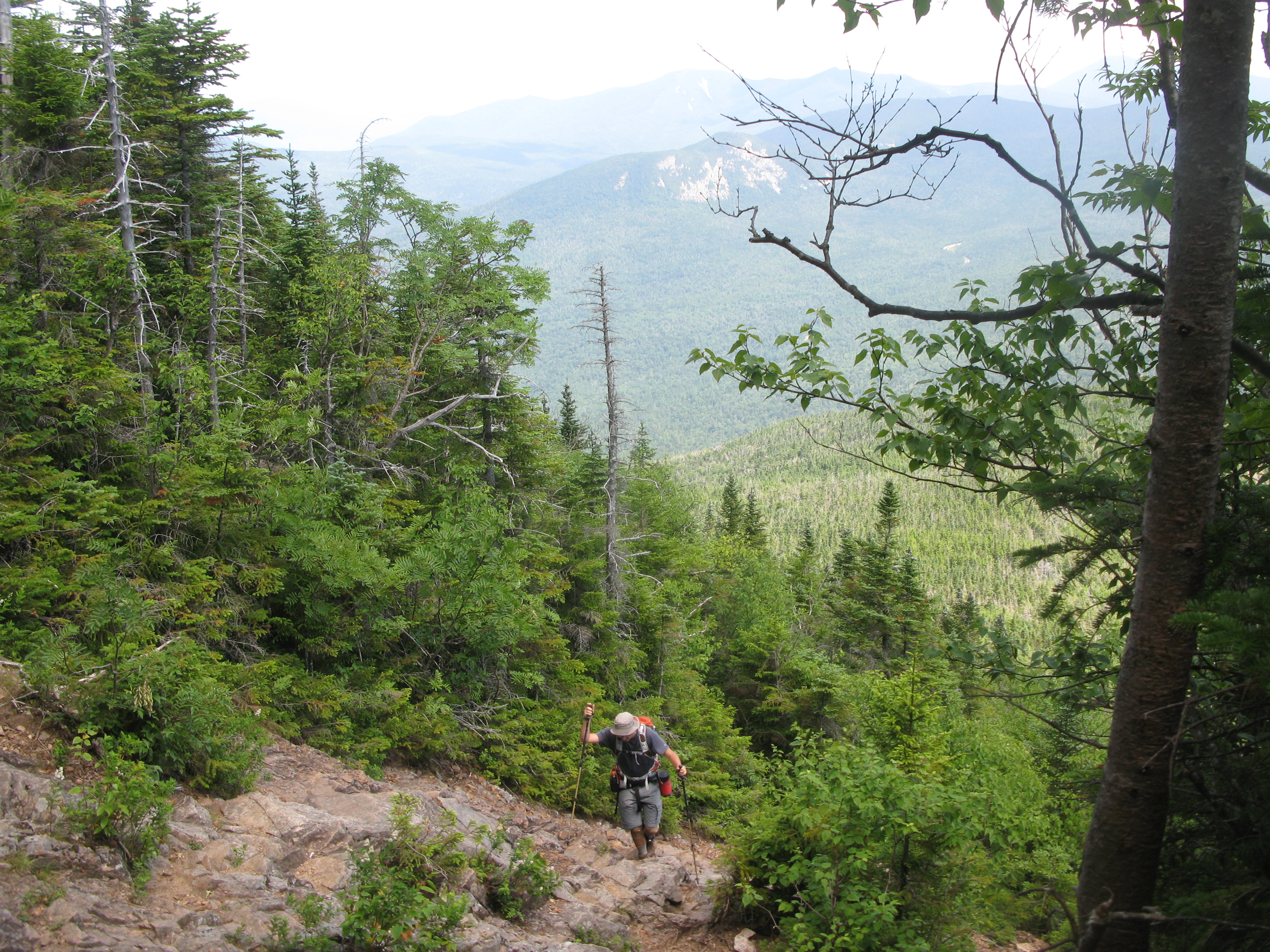 C’est par un matin très chaud que nous avons emprunté la North Twin Trail, un sentier assez plat les 2 tiers et qui traverse la Little river à 3 reprises. Nous avons gravi le North et le South Twin, chose que nous avions réalisé il y a déjà deux ans. Sur l’énorme roche du North nous avions déjà 7 km de marché par une chaleur dont j’ignorais l’existence, dans ce coin ou la pluie est roi et maître!!! Comme nous avions l’objectif de faire le Bond, le West Bond, le Bondcliff et le Zealand tous le même jour, je regardais ma montre et je me disais : avec la cadence que l’on a ce sera l’enfer. Je crois qu’en cette journée nous avions deux vitesses : le neutre et le reculons. La tête était à la veille de me fendre comme une bûche sous le coup d’une hache. Après avoir traversé les Twins, le sentier s’est mis à monter graduellement sur 3 km vers le mont Guyot, un beau mont dénudé avec une brise comme je les aimes. Ils ne restaient que 1,3 km avant d’atteindre le camping, qui à ma grande surprise est gardé par un gardien qui charge un 8$ par hiker. Le gars reste là pendant 4 mois de temps. Il descend pour deux jours à tous les 12 jours. Si je calcule bien, 1 journée de descente et une autre pour remonter et le congé est terminé. Il faut être fort pour faire ce boulot… et aimer la solitude. Après avoir monté la tente je suis exténué et nous avons encore aucune montagne de gravit qui appartienne à la liste. Nous décidons de relaxer, en fin de compte c’est les vacances, demain nous rattraperons le temps perdu de cette première journée excécrable. Malgré un total de 13,5 km j’ai le physique à terre et pourtant le moral est au top!!! En cette première journée, il y a trois choses qui m’ont totalement ébloui, la première est de rencontrer un groupe de 6 adolescentes en longue rando (je croyais que les ados détestaient marcher) la seconde est de voir une fille qui marchait avec un gros sac à dos en sandale, pas de bâton de marche et troisièmement un gardien de camping dans le fin fond des bois!!!