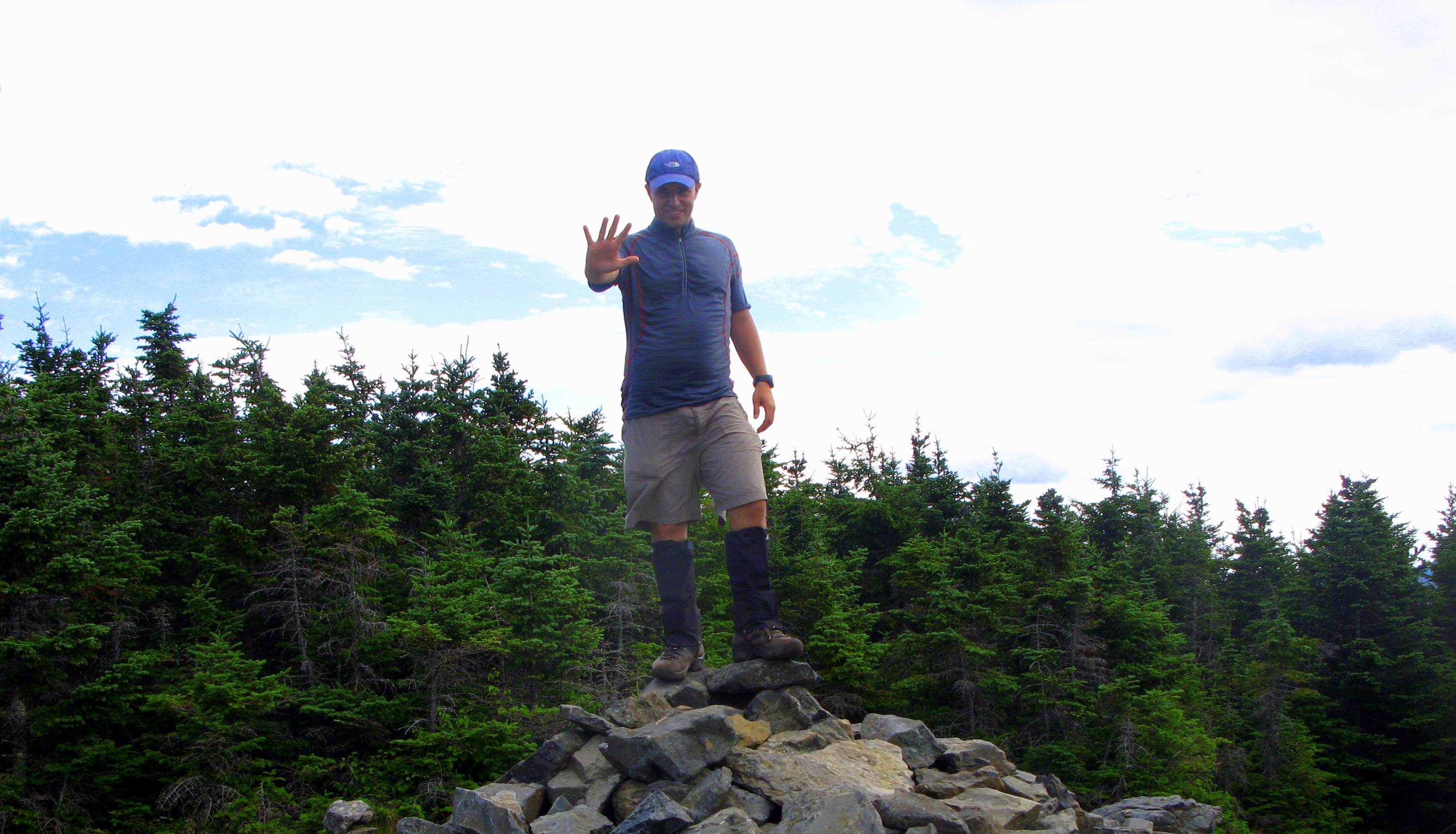 Aujourd’hui c’est nuageux et très humide. Le mont Cabot est à l’horaire en passant par The Horn (3905) et The Bulge(3950). C’est par le sentier Unknown Pond que nous avons parti sur 3,5 km de montée facile et ensuite nous avons bifurqué sur la Kilkenny Ridge Trail pendant 5 km pour passer par le Horn, qui est à mon avis le beau point de vue de la journée, un gros rocher comme promontoire avec une belle vue sur les environ et le Cabot (4170). Quant aux sommets du Cabot et du Bulge, ils sont boisés. Cette randonnée s’est effectuée sous la menace de nuages et d’un vent humide et en prime de la sueur à volonté!!! Pour se rendre au Cabot nous avons marché 17 km aller-retour.