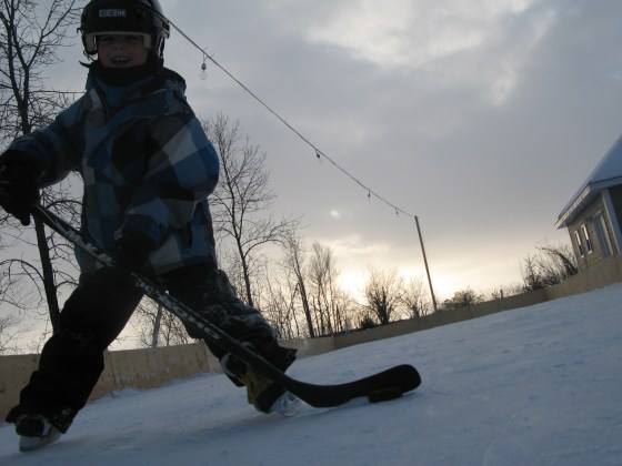 Cette année j’ai construit une patinoire extérieure derrière la maison. Ce fut pas une mince tâche; poser les bandes, le système d’éclairage, une polythène, arroser, puis encore et encore jusqu’à la bonne épaisseur et enfin la pelleter après les tempêtes de neige… c’est un travail de longue haleine qui demande de la patience et de la disponibilité. Je crois que le ratio travail/patin est de 5/1. Mais, l’important ce sont les enfants et aussi les grands qui s’amusent. Malgré un hiver relativement doux, je peux conclure que l’an prochain l’expérience sera répétée. En espérant une meilleure saison!