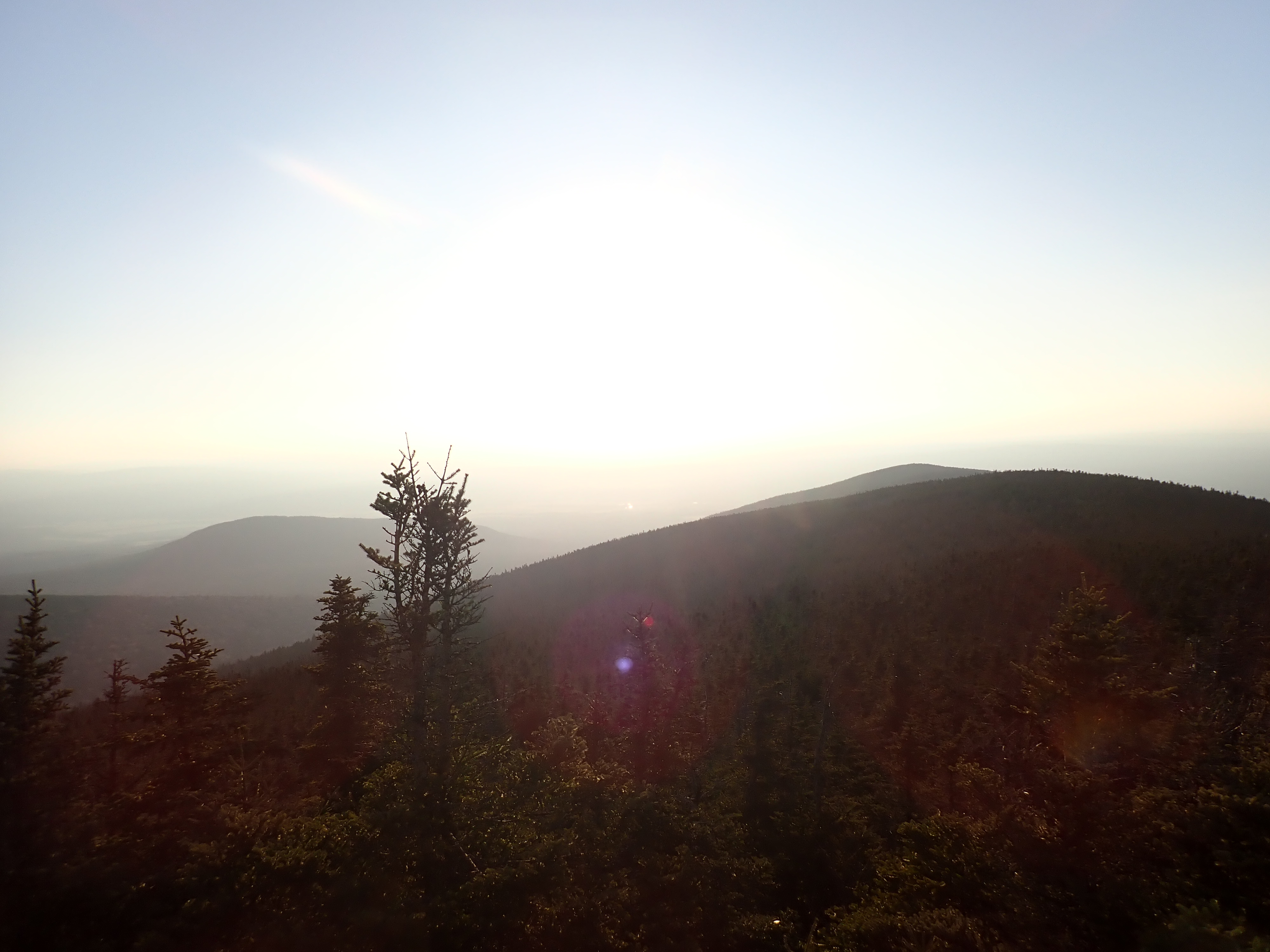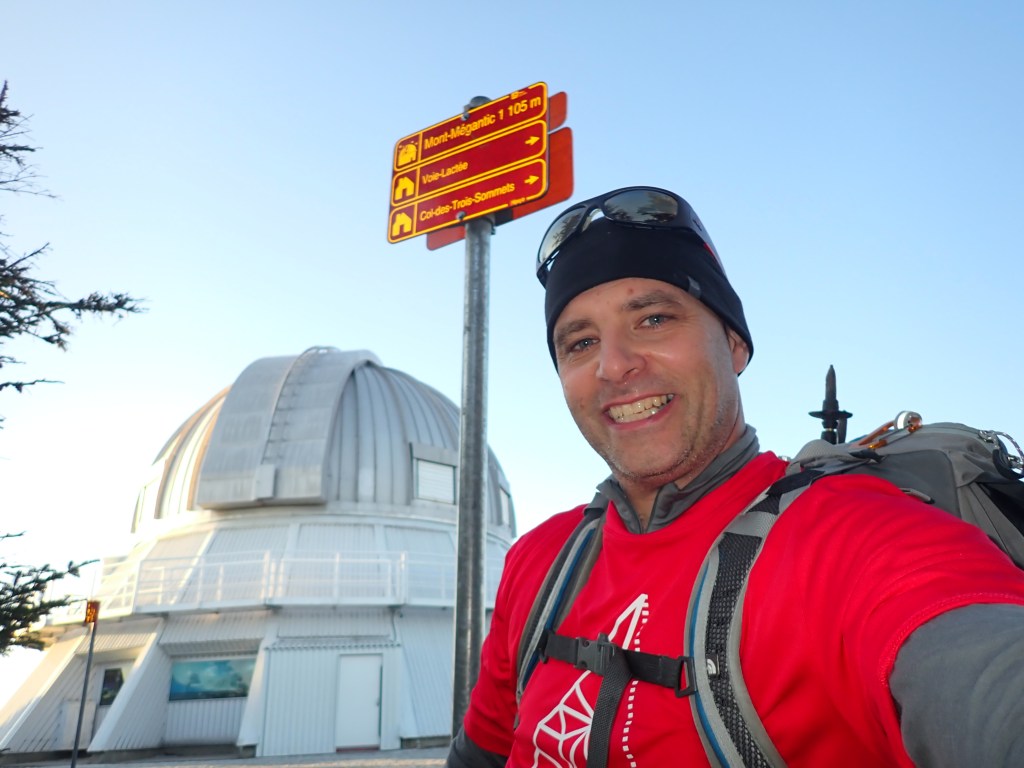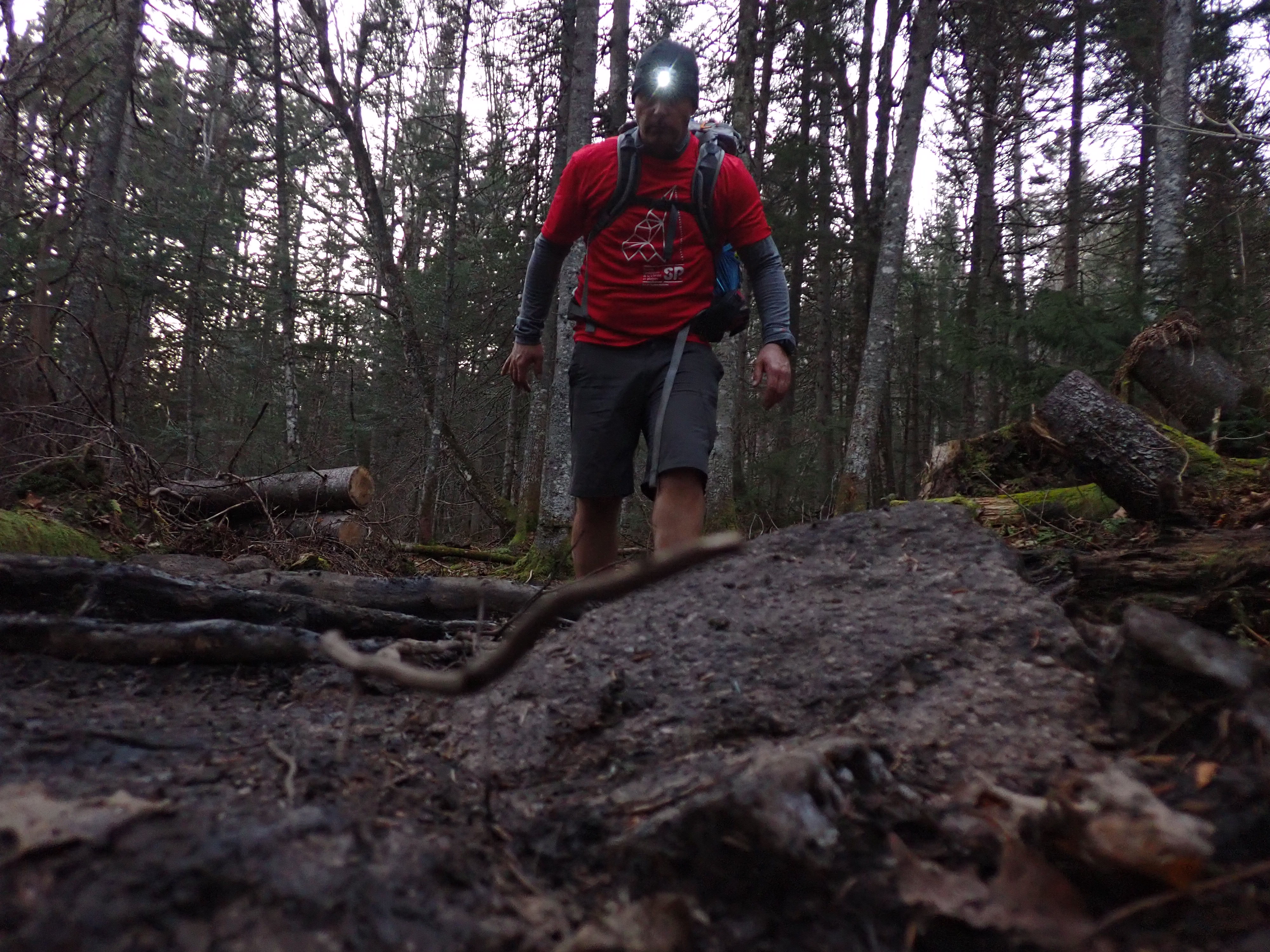 Après quelques minutes de repos au sommet, je me suis dirigé vers le fameux Mégantic. Après une descente lente de 3,3 km vers le Col-des-Trois-Sommets, un carrefour vers différentes destinations du parc. Il était temps de se diriger vers les 1 110 mètres du Mont Mégantic, le point culminant du parc. Une montée de moins de trois km dans un sentier boueux dû à la fonte des neiges accumulées dernièrement. Au sommet, le soleil se préparait à se retirer pour la nuit, après quelques photos il fallait redescendre vers le stationnement. Une descente de 3,3 km qui s’est terminée à la frontale.